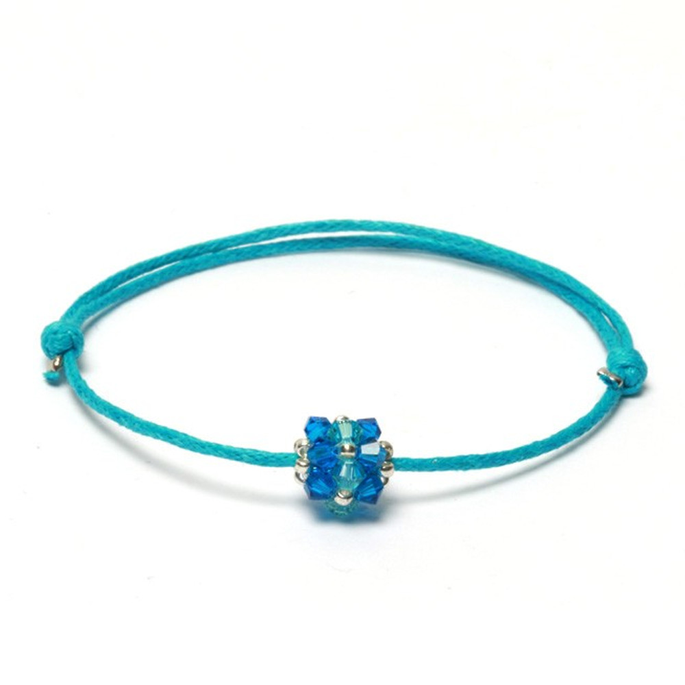 Türkiz és capri színű, Swarovski kristályokból kézzel fűzött, SPARK gömbös karkötő, viaszolt pamut szálon, csúszó csomóval, az Égei tenger varázslatos színvilága által inspirált AQUA kollekcióból. Az ékszert szikrázó bicone kristályok és az ezüst japán gyöngyök találkozása teszi különlegessé.