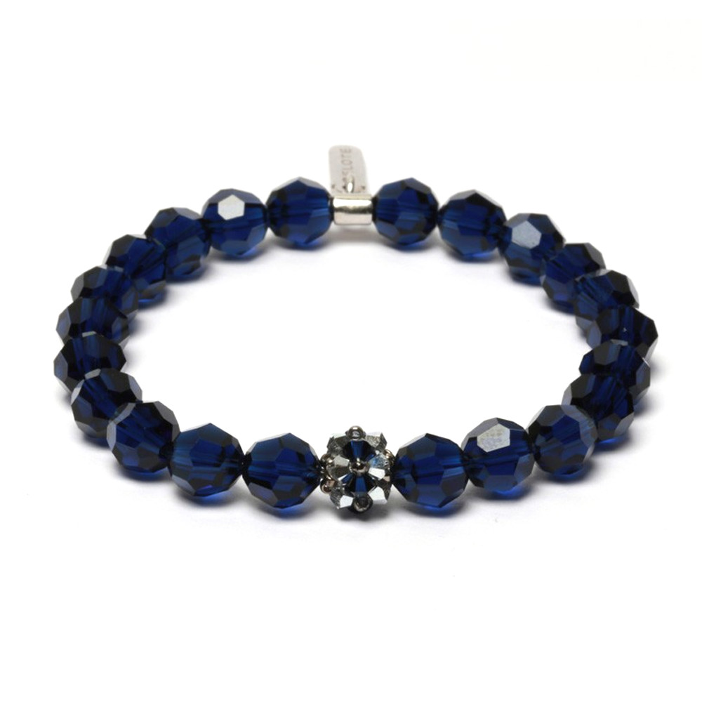8 mm-es, különleges csiszolású, éjkék színű, Swarovski kristály gyöngyökből, kézzel fűzött karkötő, gumis damilon, ezüst taggel, az Égei tenger színvilága által inspirált AQUA kollekcióból. Az ékszert az all blue - azaz tiszta kék- színösszeállítás és a közepén található, 15 darab, japán gyöngyökkel összefűzött, bicone kristályból összeállított SPARK gömb teszi ellenállhatatlanná. A 925-ös finomságú ezüst tag és tartóeleme elegánsan zárja le a gyöngyök által formált, szikrázó kört.