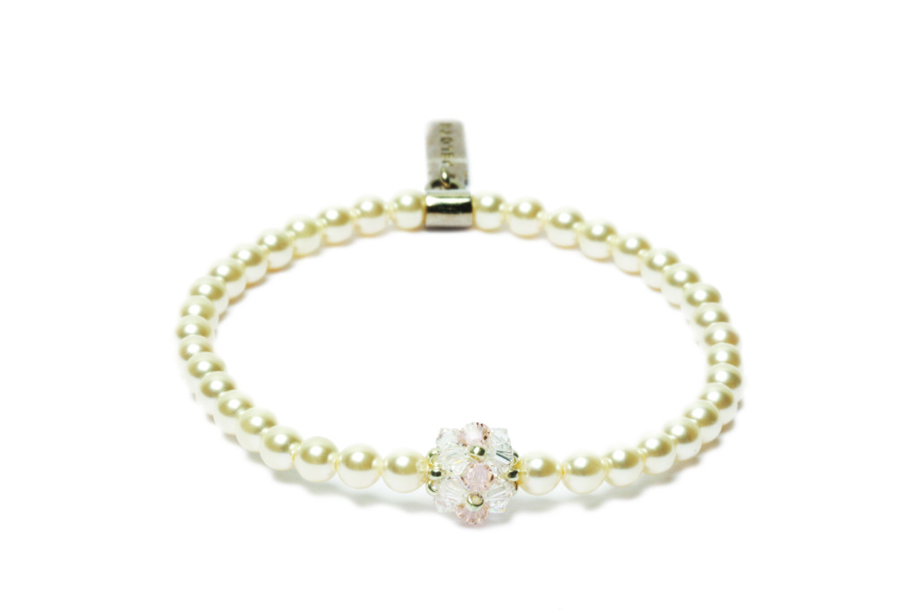 Gyöngyház színű, 4 mm-es Swarovski kristály gyöngyökből, kézzel, gumis damilra fűzött karkötő, ezüst taggel, az esküvők boldog, szerelmes hangulatát felidéző BRIDE kollekcióból. Az ékszert a selymesen csillogó bevonattal borított, különleges csiszolású kristályból készült gyöngyök illetve a közepén található, pici bicone kristályokból és japán gyöngyökből összeállított, a gyöngyökhöz passzoló színben szikrázó SPARK gömb teszi egyedülállóvá. A 925-ös finomságú, olasz ezüstből készült tag és tartóeleme elegánsan zárja le a romantikus gyöngyök sorát.