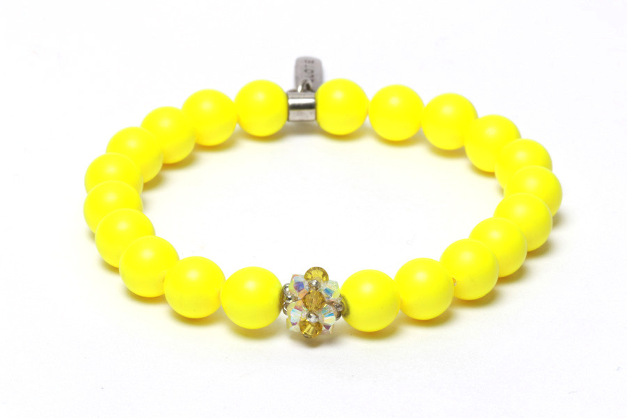 A színpompás COLORS kollekció neon vonalának ékszereit a vidám, tarkabarka cukormázzal borított nyalókák inspirálták. A Swarovski által kifejlesztett, különleges csiszolási mechanizmussal készült, neon sárga bevonattal borított, 8mm-es gyöngyöket és a csillogó kristályokból készült SPARK gömböt gumis damilra, kézzel fűztük fel. A 925-ös finomságú, ródiumozott ezüstből készült PELOTE tag és az ezt tartó záróelem ad tökéletes befejezést ennek az élénk színű, fiatalos darabnak. A termék az S3 kategóriába tartozik és több méretben elérhető. A fotón szereplő ékszer színei a valóságtól eltérhetnek. Viseld a COLORS NEON SPARKjait és SZIKRÁZZ - SPARK Yourself!
