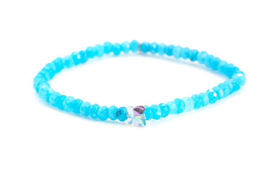A pillangókat formázó Swarovski kristályokkal díszített ékszerek a szabadság jegyében születtek. A filigrán darabok egyediségét a színpompás drágakövek és az aprólékos kézi munkával történő elkészítés adja. A türkizkék achát gyöngyökből készült karkötő középső eleme egy pillangót formázó, ragyogó Swarovski szimbólum kristály. A kézzel fűzött ékszert 925-ös, ródiumozott ezüstből készült záróelem teszi tökéletessé. Az ékszer színei a valóságban a fotótól enyhén eltérhetnek. A karkötő több méretben rendelhető.