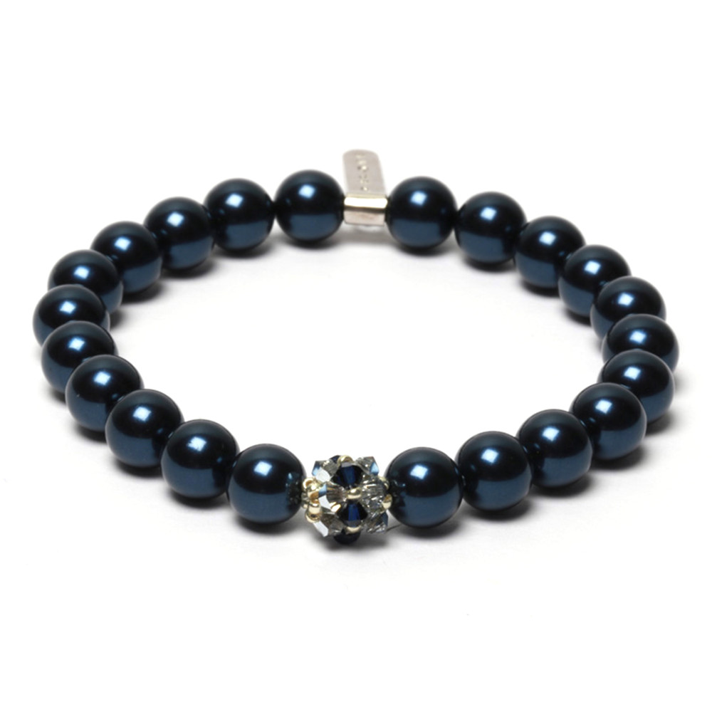 Éjkék, 8 mm-es Swarovski kristály gyöngyökből, gumis damilra, kézzel fűzött karkötő, ezüst taggel, az 1920-as évek által ihletett GATSBY kollekcióból. Az ékszert a különleges csiszolású kristályból készült gyöngyöket borító, selyemfényű bevonat illetve a közepén található, 15 darab bicone kristályból és japán gyöngyökből álló SPARK gömb teszi egyedülállóvá. A finom vonalú, ródiumozott, olasz ezüstből készült tag és tartóeleme elegáns befejezést ad a karkötőnek.