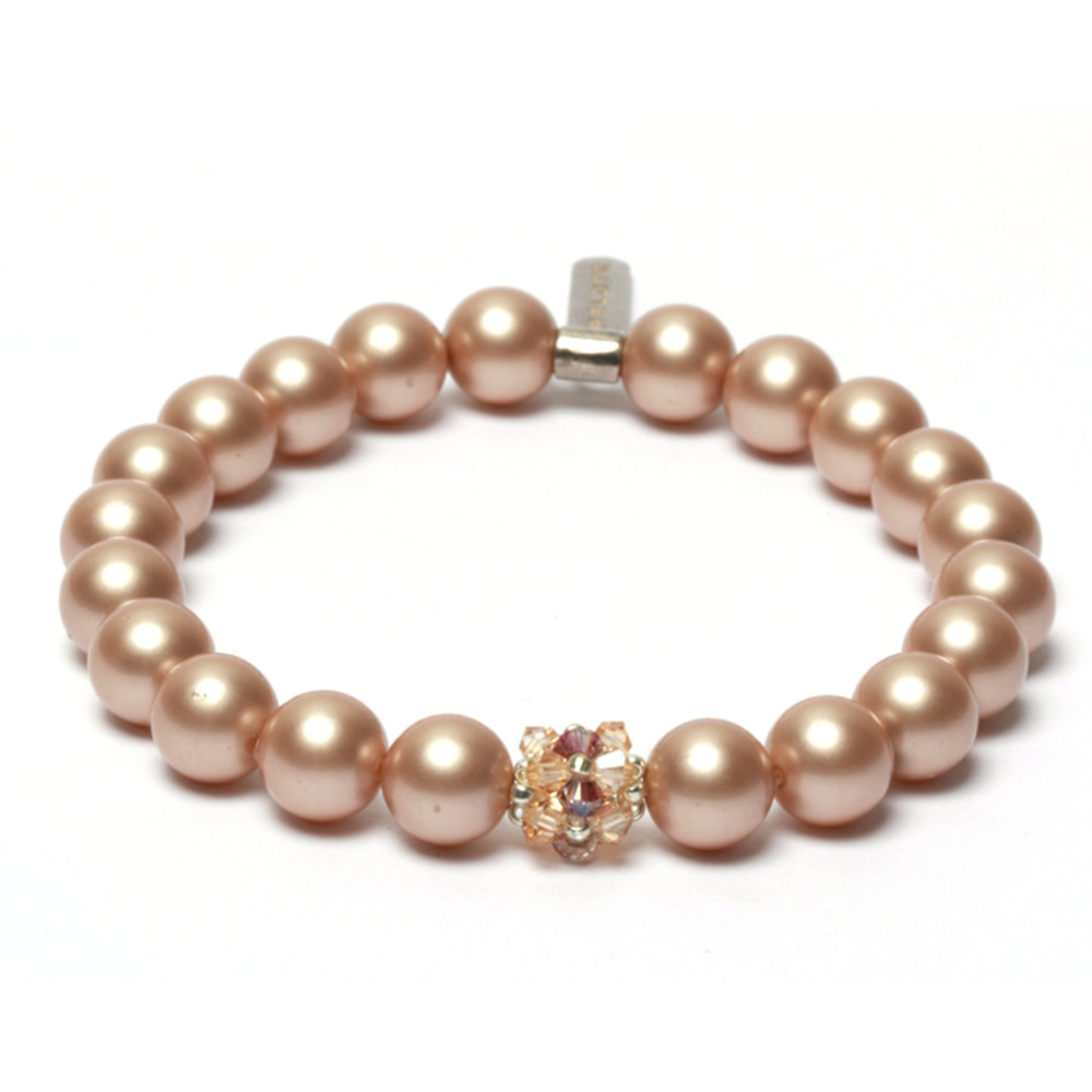 Mandula színű, selyemfényű 8 mm-es Swarovski kristály gyöngyökből,gumis damilra fűzött karkötő, ezüst taggel, az 1920-as éveket idéző GATSBY kollekcióból. Az ékszert a selymesen csillogó bevonattal borított, különleges csiszolású kristályból készült gyöngyök illetve a közepén található, pici bicone kristályokból és japán gyöngyökből összeállított SPARK gömb teszi egyedülállóvá. A 925-ös finomságú, olasz ezüstből készült tag és tartóeleme elegánsan zárja le a karkötőt.