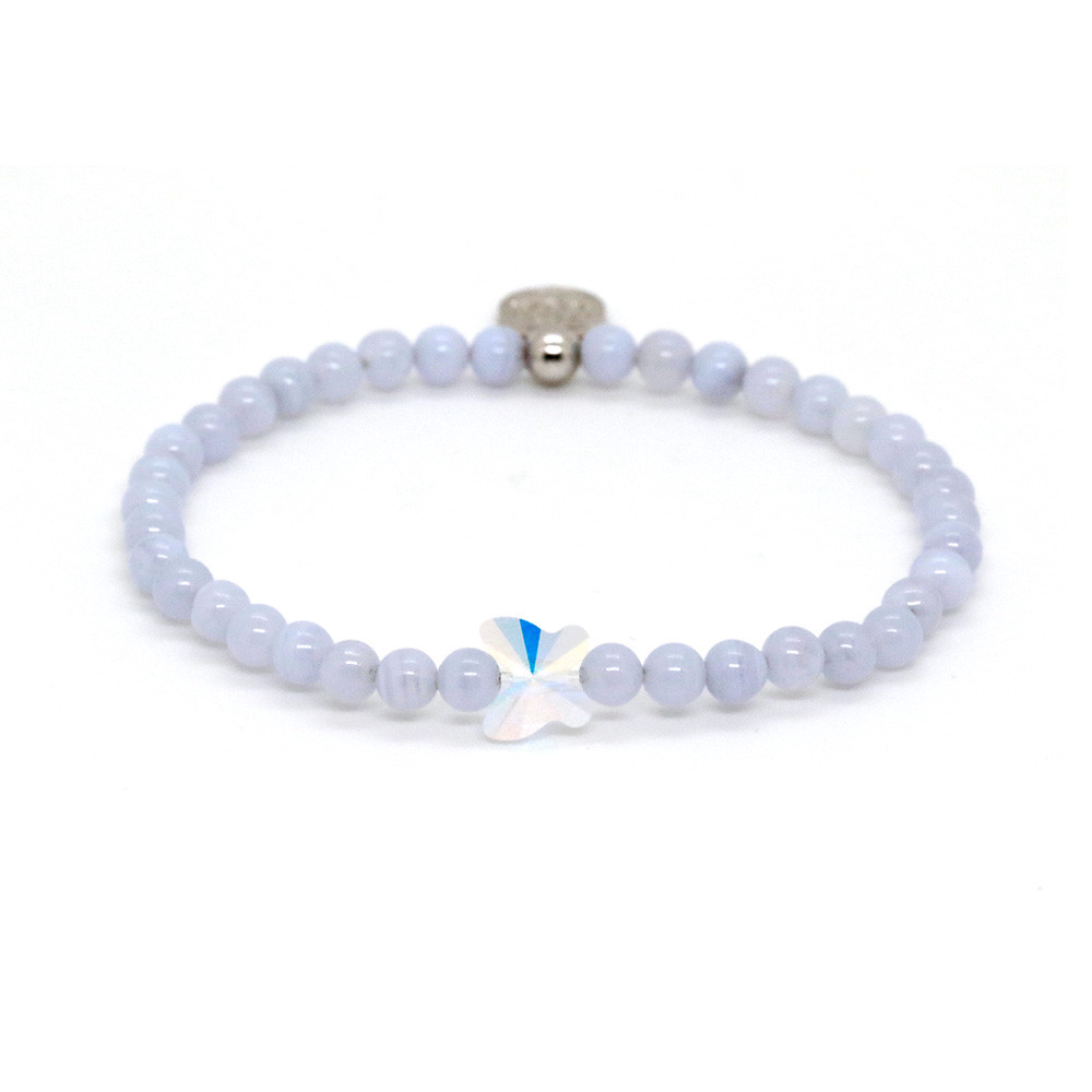 A PICNIC ON THE MEADOW válogatott kollekciót a tavasszal ébredő természet, a baráti piknikezés, a nevetés és az együtt töltött, boldog idő hangulata ihlette. Romantikus pasztellek, kedves, pillangót formázó Swarovski kristályok, szikrázó charmok és különleges drágakövek fémjelzik a válogatás ékszereit. A kalcedongyöngyökből készült karkötő középső eleme egy pillangót formázó, ragyogó, aurora borealis színű Swarovski szimbólum kristály. A lepke a szabadság jelképe, utal a tavasz beköszöntéhez kapcsolható életérzésre, az örömre, hogy ismét lehetőségünk van több időt a szabadban, a természetben tölteni. A kézzel fűzött ékszert 925-ös, ródiumozott ezüstből készült záróelem teszi tökéletessé. Az ékszer színei a valóságban a fotótól enyhén eltérhetnek. A karkötő több méretben rendelhető.