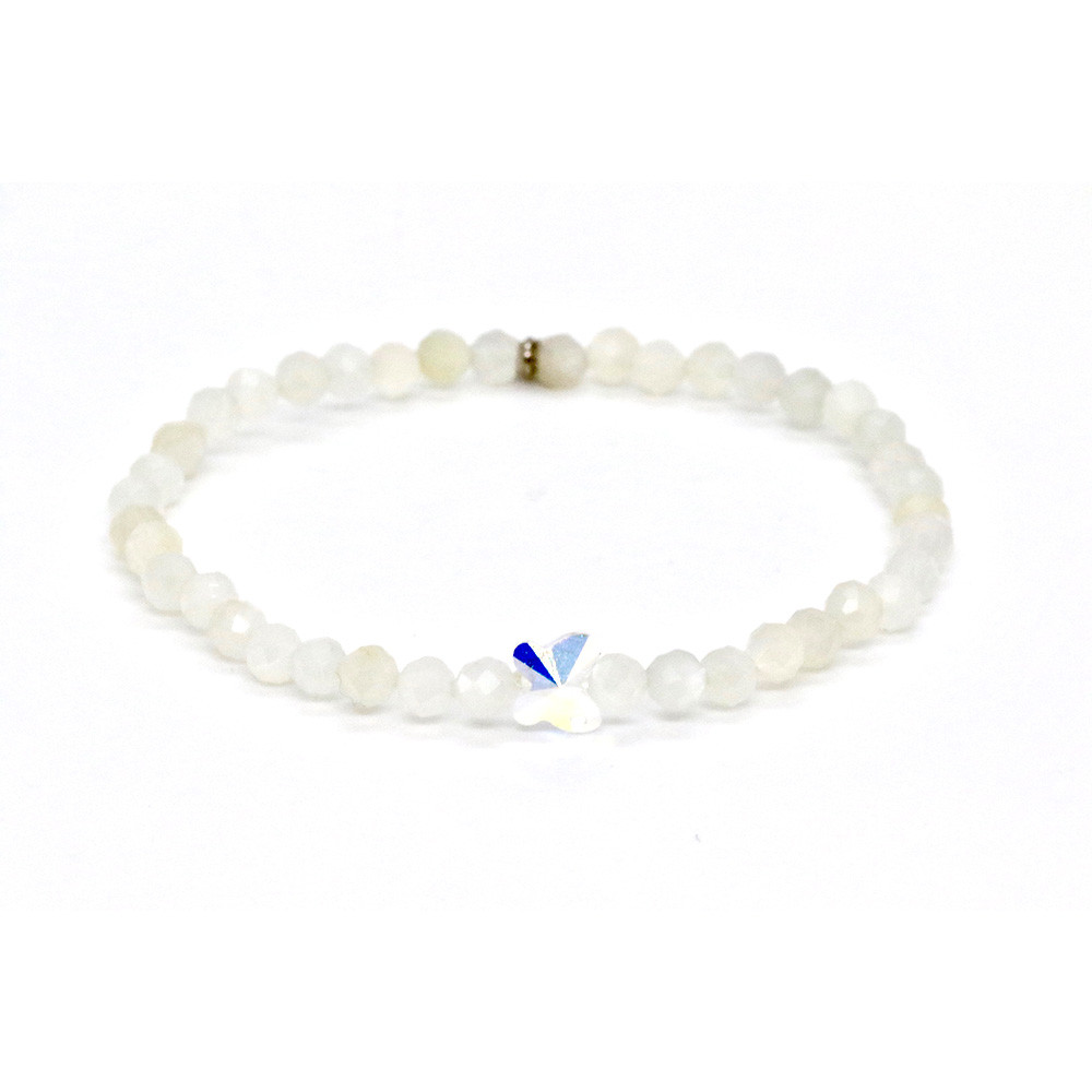 A PICNIC ON THE MEADOW válogatott kollekciót a tavasszal ébredő természet, a baráti piknikezés, a nevetés és az együtt töltött, boldog idő hangulata ihlette. Romantikus pasztellek, kedves, pillangót formázó Swarovski kristályok, szikrázó charmok és különleges drágakövek fémjelzik a válogatás ékszereit. A fehérholdkő gyöngyökből készült karkötő középső eleme egy pillangót formázó, ragyogó, aurora borealis színű Swarovski szimbólum kristály. A lepke a szabadság jelképe, utal a tavasz beköszöntéhez kapcsolható életérzésre, az örömre, hogy ismét lehetőségünk van több időt a szabadban, a természetben tölteni. A kézzel fűzött ékszert 925-ös, ródiumozott ezüstből készült záróelem teszi tökéletessé. Az ékszer színei a valóságban a fotótól enyhén eltérhetnek. A karkötő több méretben rendelhető.